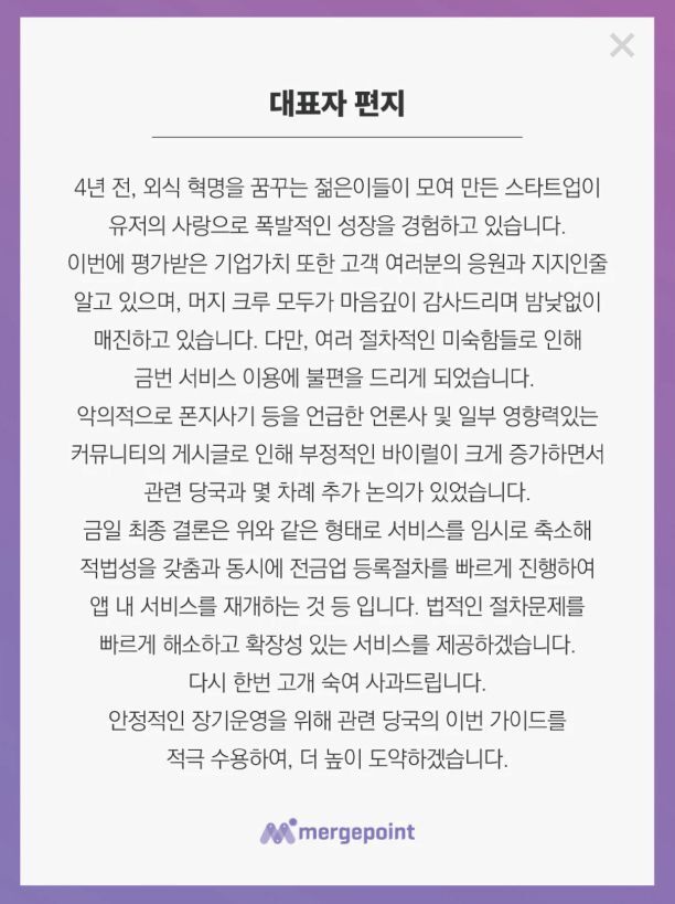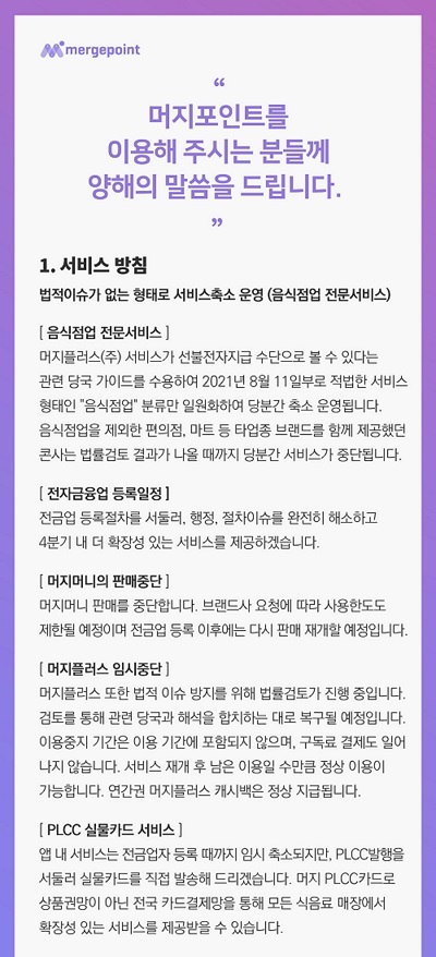 사실이야 어찌되었든, 금융당국은 전금업에 등록하지 않고 선불전자지급 사업을 하고 있다는 의견을 머지포인트 측에 전달하였고, 결국 8 월 11 일 머지 포인트는 법적 문제 발생을 피하기 위해 갑작스럽게 기존 대비 엄청난 비율의 혜택 축소를 발표하였고 이후 모두 알다시피이에 따른 환불 대란이 시작되었습니다.