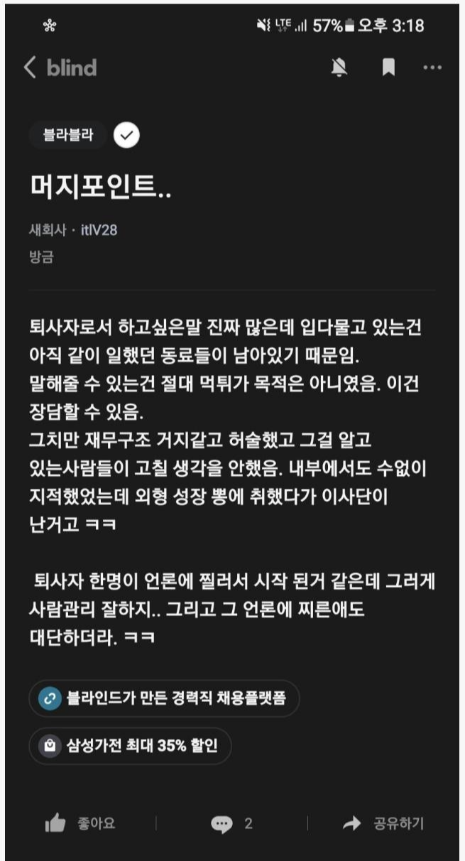 그렇다면 머지포인트는 처음부터 작정하고 사기를 친 것일까요? 사실 이런 상테크 및 재테크 업계에서 어느 정도 폰지성이 있는 사업 모델은 의외로 적지 않습니다. 나름 경영을 잘해서 잘 EXIT 한 경우도 있지만 결국에는 이렇게 머지포인트 처럼 폭탄이 터지는 경우도 많은데요. 사실 Blind 라던가 또는 잡 플래닛 같은 간접적으로 회사 정보들을 얻을 수 있는 사이트들의 정보에 따르면 다들 열심히 하려 했지만 외형성장에 취해 너무나 회사 체계가 허술했는데도 전혀 고치지 않았다는 의견들이 있어 애당초 처음부터 직접적인 사기를 칠 생각은 없었던 것 같습니다. 다만 쿠팡처럼 늘어나는 가입자수와 회사 규모를 통해 지속적으로 대출을 받고 그 동안 적절한 가격에 판매하거나 아니면 쿠팡처럼 확실한 쩐주를 얻고자 한 것 같은데 어설픈 경영으로 인해 진작 그러기 전 구멍이 뚫린 것 같습니다. (물론 그것도 크게 보면 사기성이지만) 하지만 전형적인 폰지 패턴으로 보이는 점들이 많기 때문에 많은 상테크 또는 재테크 커뮤니티에서는 애초부터 어느정도 크게 한탕하고 먹튀하려고 했던 것 아니냐는 의심을 지우지 않고 있습니다.