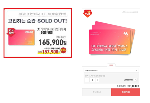 50 만원을 20% 할인된 \399,000 에 판매하는데 벌써 눈치빠른 분들은 이런 현상에서 벌써 머지포인트의 재무 상태를 크게 의심하고 폭탄돌리기의 전초전 같다고 예상하는 분들이 많이 나타났지만 (이미 먹튀 사기꾼들의 뻔한 패턴이 이때부터 나타나기 시작한거죠. 항상 처음에는 돈을 잘 줍니다. 이제 드디어 50 만원권에서 마수가 나왔다고 예상한 분들이 많았습니다.) 오히려 인터넷 상에서 머지 나올때 부터 터진다는 그놈의 폭탄은 언제 터짐? 이라는 비웃음만 받았고 결국 시장에서 50 만원 권도 완판되기에 이릅니다. 없어서 못사게 되는거죠.