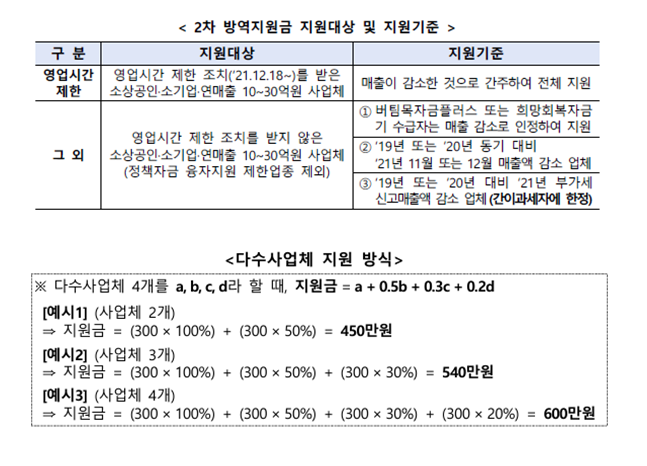 - 1차 방역지원금 100 만원에서 2차 방역지원금 300 만원으로 증액