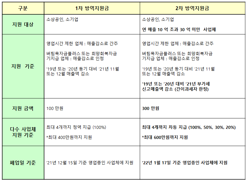 이번 2차 방역지원금은 1차 때와는 달리 조금 더 폭넓은 지원을 목표로 신속 지급될 예정으로 1차와 비교하여 어떤 점이 달라졌는지 확인해 보면 하기와 같습니다.