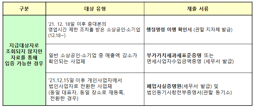 - 지급대상자 조회되나 추가 확인 제출 필요 (공동대표, 사회적 기업, 협동조합 등)