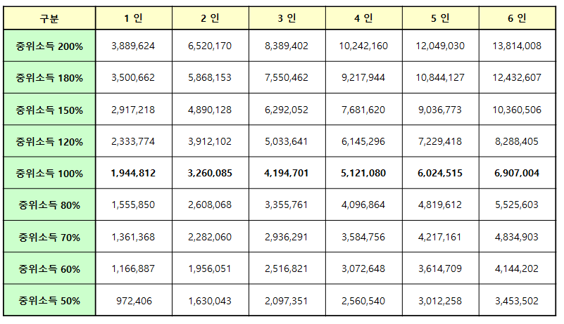 정확히 중위소득 50% ~ 150% 구간이 대한민국 중위소득 계층이라고 할수 있습니다.