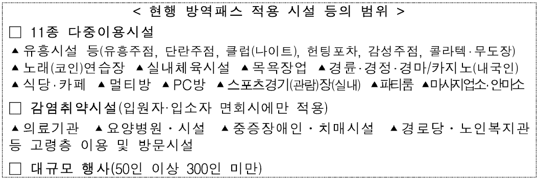 - 현 방역패스 적용 다중이용시설 11 종과 감염취약시설, 대규모 행사 (50 인 이상 300 인 미만) 방역패스 중단