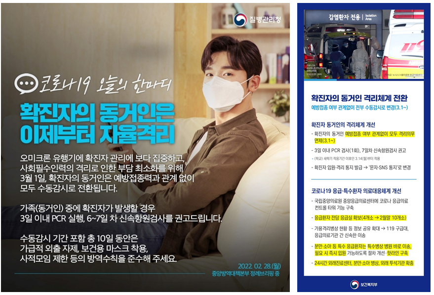방역패스 해제로 밀접 접촉자 격리 기준에도 변화가 있었습니다. 그동안 확진자의 동거인 중 백신 미접종자는 7일간 자가격리를 진행했지만 이제 접종 여부와 무관하게 격리 의무가 없어졌고 수동감시 대상으로 바뀌었습니다.