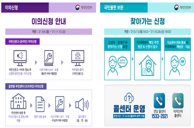 작년과는 달리 온라인으로도 이의 신청이 가능한데요. 국민지원금 신청이 개시되는 9월 6일 월요일부터 온라인 국민신문고 또는 주소지를 관할하는 읍면동 주민센터에서 접수가 가능하니 참고하시면 좋을 것 같습니다.