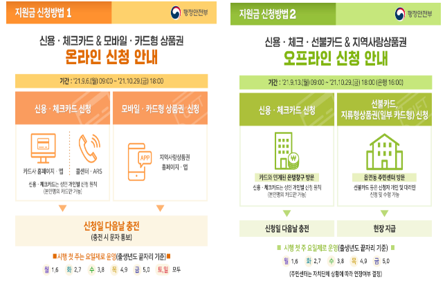 이렇게해서 선정된 국민지원금 대상자는 신용카드 및 체크카드 충전, 지역사랑 상품권, 선불카드 중 선택하여 신청할 수있는데요. 또한 신용ㆍ체크카드 충전을 원하시는 분들은 9월 6일 월요일 부터 본인이 사용하는 카드사의 홈페이지나 앱을 통해 온라인으로 신청이 가능하며 9월 13일 월요일부터는 카드와 연계된 은행에서 오프라인 신청도 가능하다고 하니 참고하시기 바랍니다.