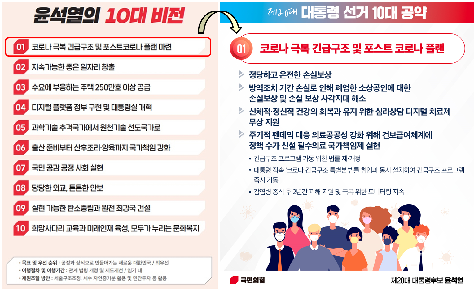 윤석열 정부의 10 대 공약 중 가장 처음에 있는 공약이 바로 코로나 극복 긴급구조 및 포스트 코로나 플랜 마련인데요. 바로 그 공약의 첫번째가 정당하고 온전한 손실보상 즉, 소상공인 지원 정책입니다. 그만큼 윤석열 정부가 비중을 가지고 진행할 정책이라고 생각됩니다. 윤석열 당선자는 취임하자마자 코로나 긴급 프로그램을 가동할 예정이라고 합니다.