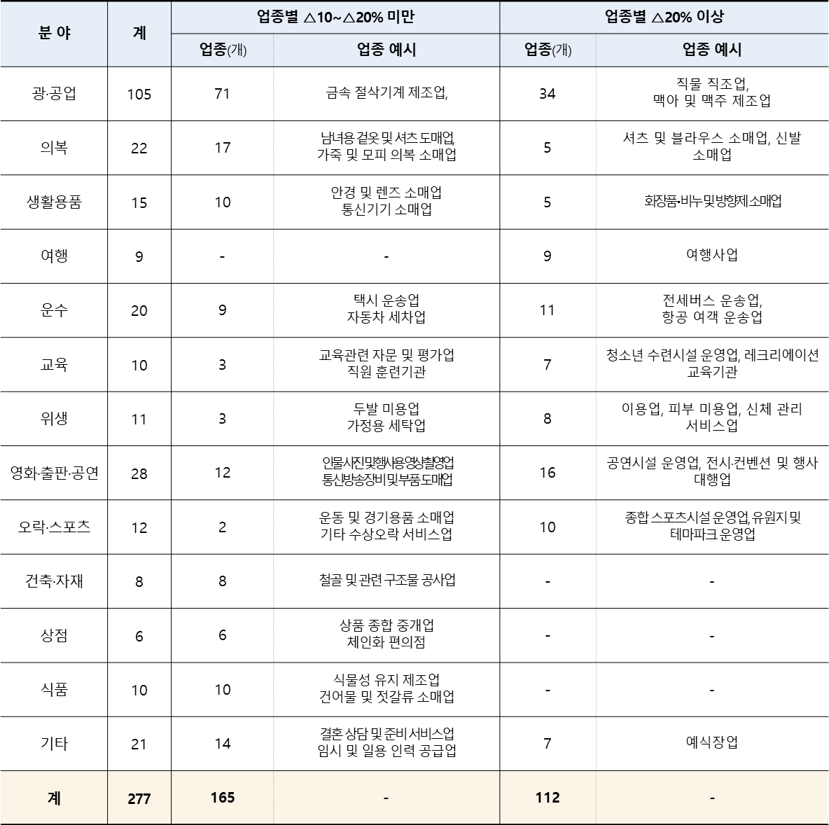 * 경영위기업종 : 국세청 부가세 매출 신고액이 2019년 대비 2020년에 10%이상 감소한 13개 분야 277개 업종