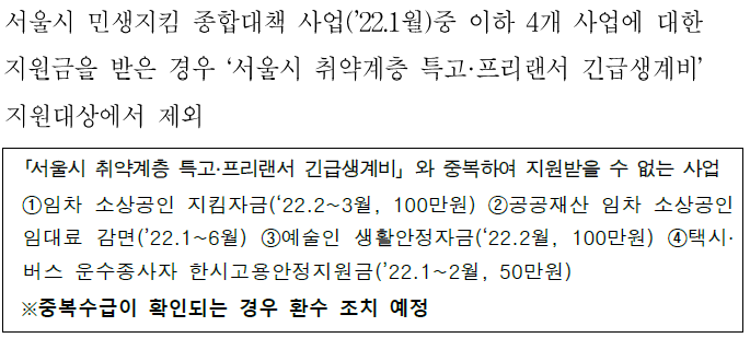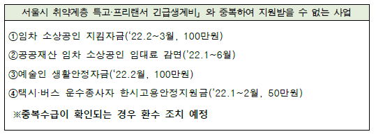 이번 서울특별시의 특고, 프리랜서 긴급생계비 사업의 개요는 정부 지원금에 더해서 추가로 더 지급하겠다는 개념과 같습니다.