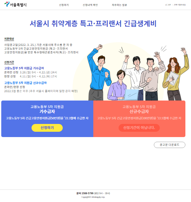 서울특별시에서 특고, 프리랜서 긴급 생계비 50만원 지원이 28일부터 시작되었습니다. 급격한 소득감소로 생계 위기에 놓인 서울 거주 특고 프리랜서에게 실질적이고 즉각적인 도움을 준다는 취지로 시작된 사업이기 때문에 사실상 일반적인 지원금 심사 기준인 소득감소등의 별심사 없이 고용노동부가 지원한 5차 긴급고용안정지원금의 수령 사실이 증빙만 된다면 바로 지원됩니다.