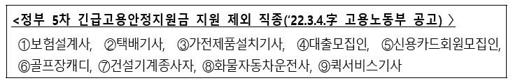 단, 이번에도 지급 제외 업종은 고용노동부에서 진행한 5차 긴급고용안정지원금의 업종과 동일합니다.