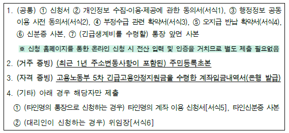 신청 방법 및 제출 서류 기존 5차 긴급고용안정지원금 수급자의 경우와 동일