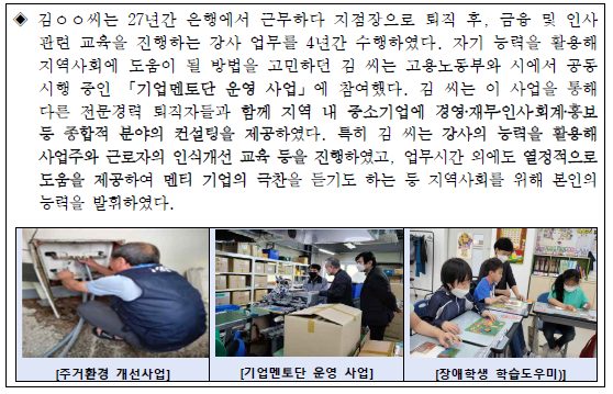 신중년 경력형 일자리에 참여하시면 취약계층 주거환경 개선, 중소기업 경영 컨설팅, 장애인 학생 교육, 공사현장 산업안전 컨설팅, 관광 약자 여행 지원, 플랫폼 노동자 직업상담, 농업기술 전수 서비스 등 다양한 근무를 진행하시게 됩니다.