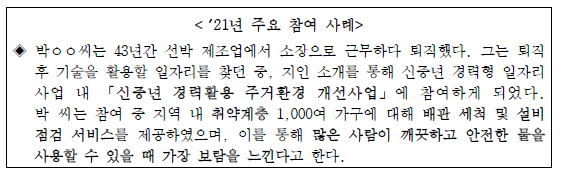 신중년의 경력이 필요한 지역서비스 일자리를 찾아 제공함으로써 신중년의 지역사회에서의 역할을 강화하고 또한 재취업을 도모하는 2022년 신중년 경력형 일자리 사업으로 정부에서 비중있게 추진하고 있는 중장년 고용정책들 중 하나 입니다.