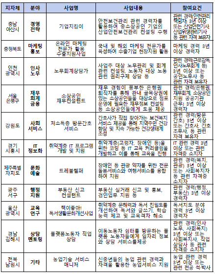 - 정부지원형 사업으로 50~69세 미취업자 중에서 전문자격이나 소정의 경력이 있는 분들 지원 가능