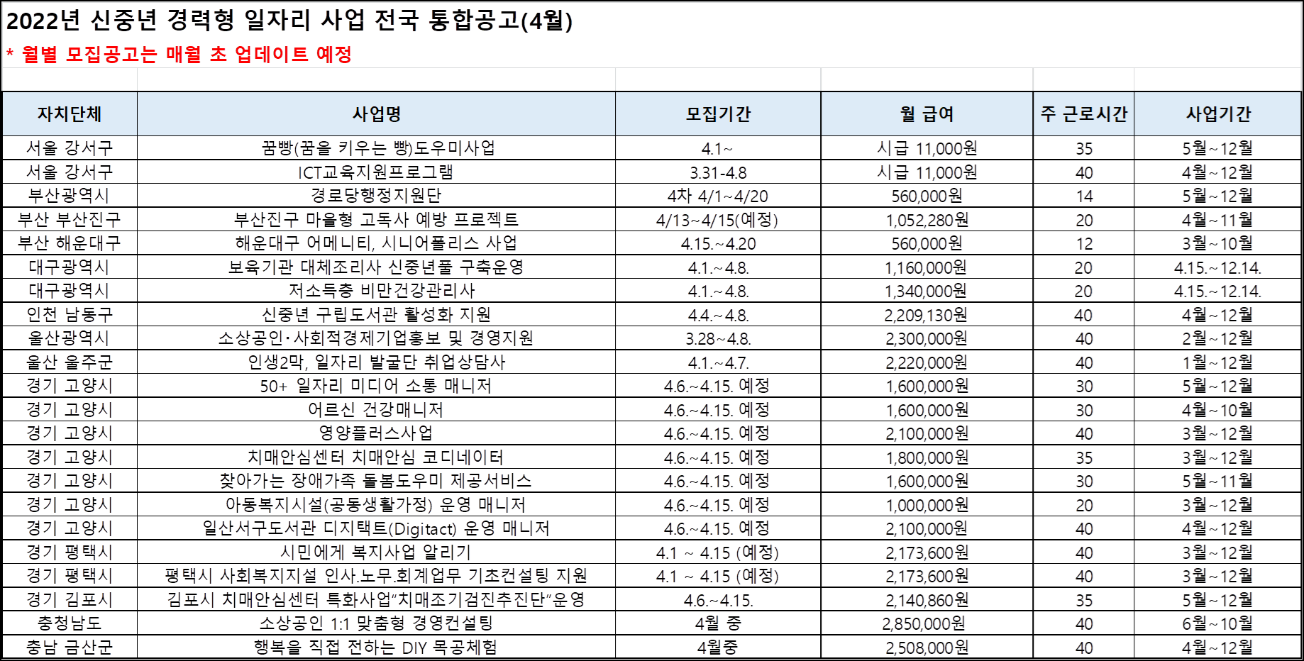 일자리 리스트는 매월 업데이트 되므로 이번에 안되시더라도 계속 주시하고 계시면 적당한 근무시간에 꽤 괜찮은 급여의 일자리를 얻으실 수 있으므로 알아두신 후 가끔씩 월별로 모니터링 하시면 좋을 것 같습니다.