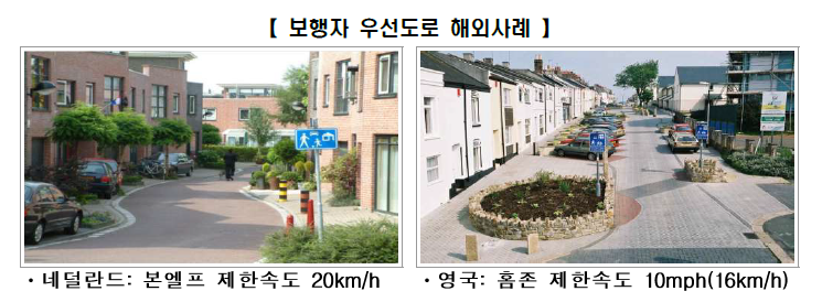 - 소위 골목길에 대한 보행자 우선도로 개념 도입, 제한속도 20km/h이하
