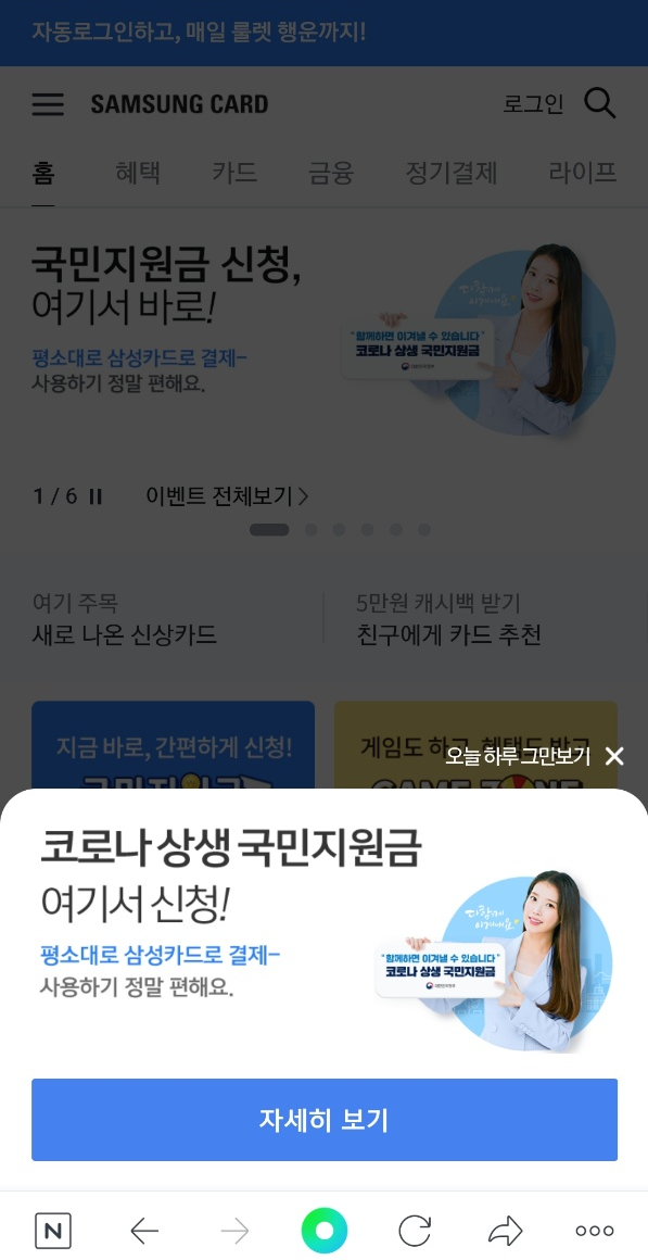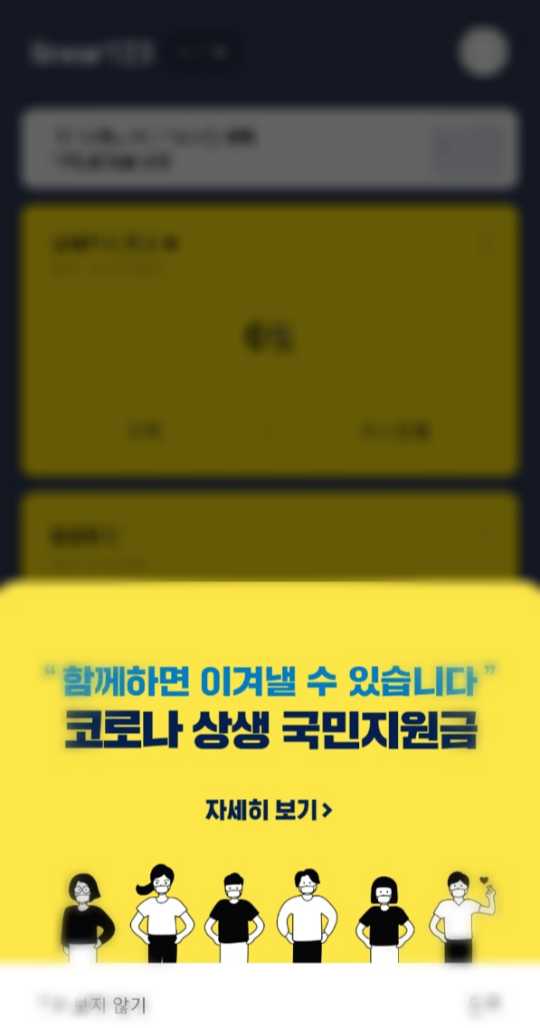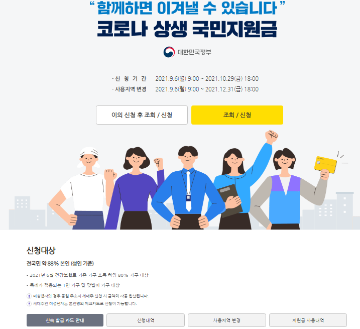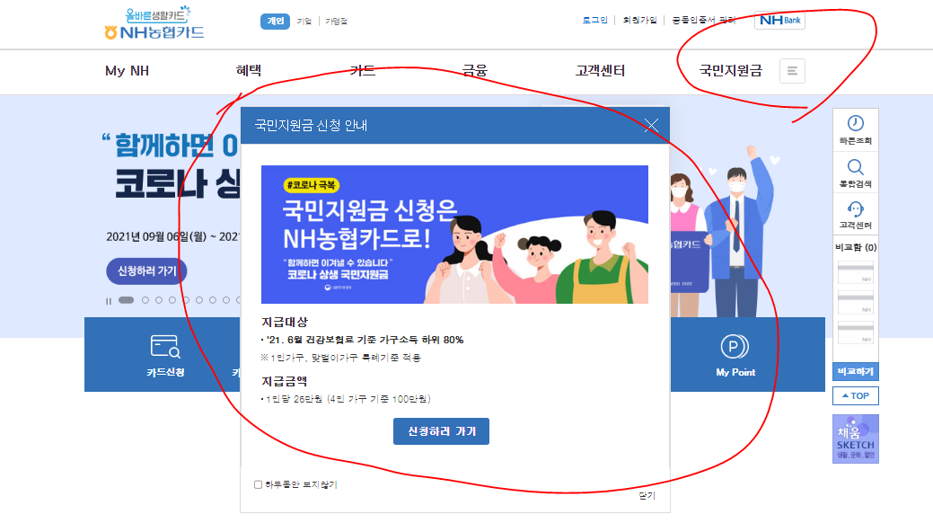 - 방법 : 홈페이지 국민지원금 자동 팝업 클릭 또는 메뉴 중 국민지원금 찾아 클릭 및 신청