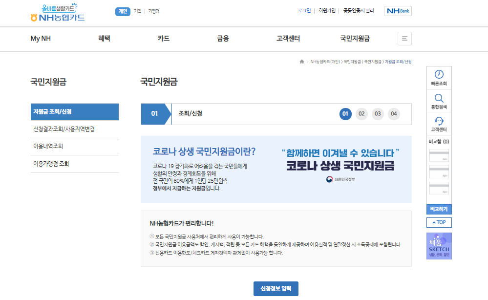 - 방법 : 초기 국민 지원금 팝업 클릭 또는 초기 메인 화면 좌측 #국민지원금 태그 클릭 후 신청 버튼 클릭