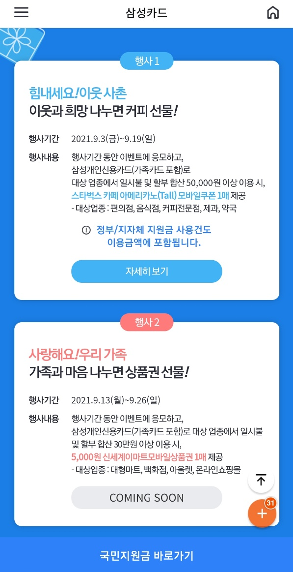 - 혜택 : 9월 한달 동안 재난지원금을 포함한 합산 결제액이 40만원 이상인 고객 중 추첨하여 경품을 제공