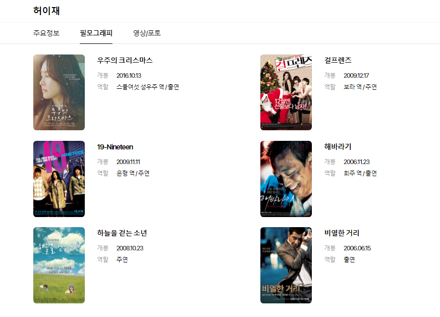그리고 허이재씨는 SBS 일일드라마 '당신은 선물' 그리고 영화 '우주의 크리스마스' (감독 김경형, 제작 뿌리깊은나무들(주)) 로 컴백을 알렸는데요. '우주의 크리스마스' 제작 및 촬영은 드라마 출연 보다 먼저 진행되었기 때문에 사실상 복귀작은 우주의 크리스마스라고 보는게 맞을 것 같습니다.