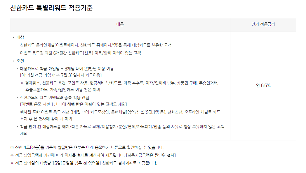 다음은 연 6.6% 신한카드 특별리워드 적용 기준입니다.
