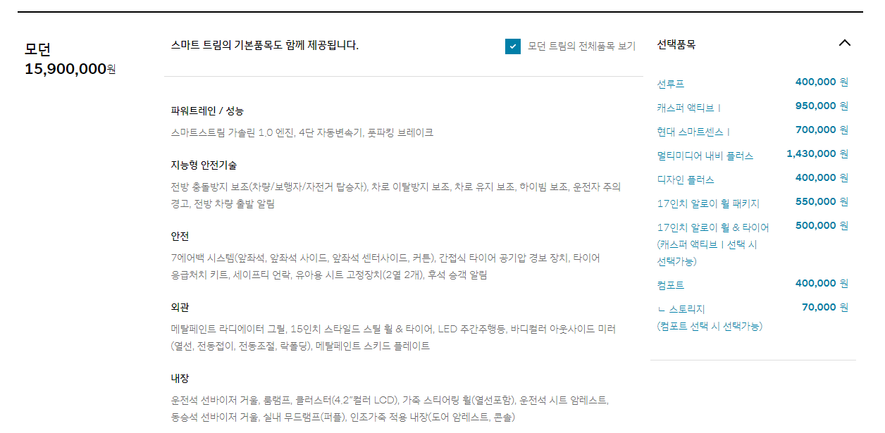 옵션을 보면 대체 뺄게 없습니다. 기껏 뺀다고 하면 썬루프 하나정도네요. 컴포트는 좌석 슬라이딩과 리클라이너 기능이라 반드시 넣어야 하는 옵션이고 멀티미디어 내비 플러스도 반드시 넣어야 합니다. 영업용 차량도 아니고 오래 탈 차량인데 오디오 하나 달랑 달고 출고할수는 없잖아요. 이거 선택 안하면 차 사고 두고 두고 후회한다는 휠패키지도 넣어야겠죠. 이왕 사는데 캐스퍼 액티브와 현대 스마트센스도 있어야죠. 이것 저것 다 사면 썬루프 하나 남는데 솔직히 썬루프도 욕심이 나긴 하죠. 이렇게 되면 뺄 옵션이 없어요. 2 천만원 그냥 넘어가 버립니다.