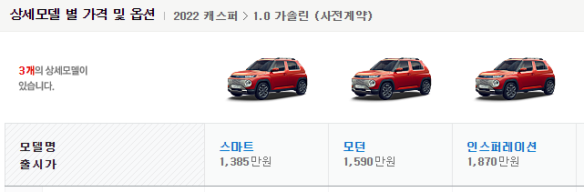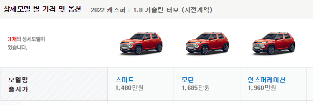 여기서 가솔린 1.0 터보 엔진을 탑재한 터보 모델은 '캐스퍼 액티브'라는 선택 사양으로 운영이 되는데 각 트림별로 가격이 90 ~ 95 만원 정도 더 추가가 됩니다.