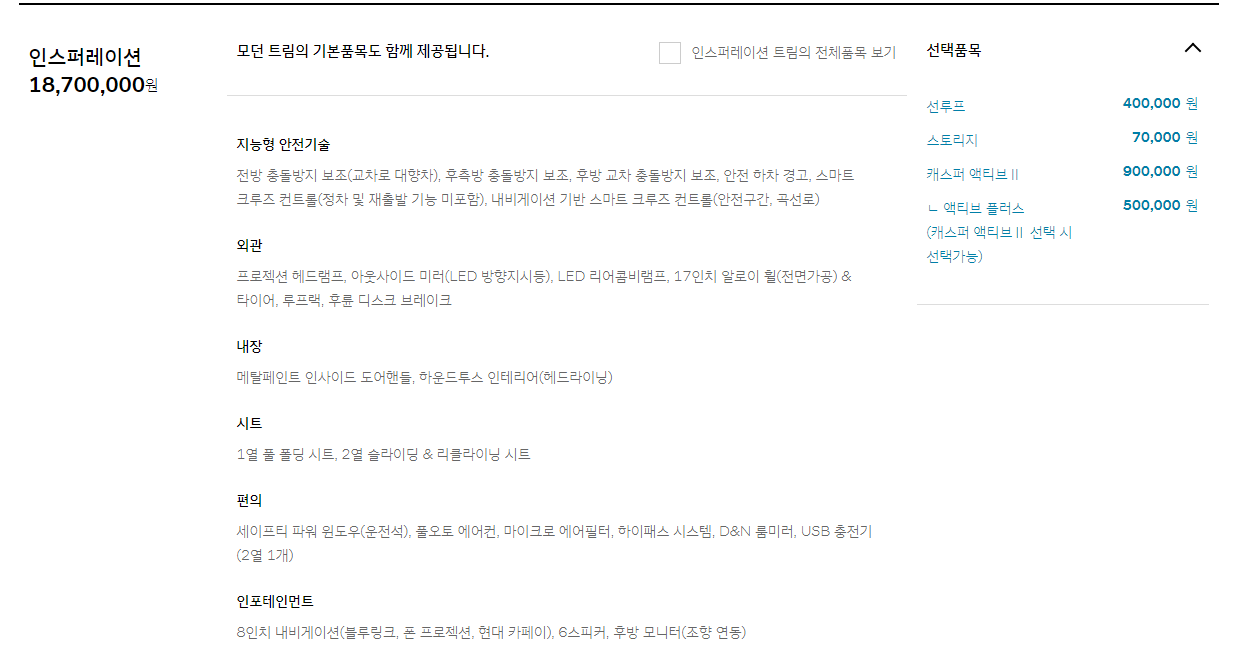 그러면 결론은 뭘까요? 인스퍼레이션 사라는 거네요. 즉, 뭘 선택하든 2 천만원 이상이 캐스퍼의 소위 "My Car" 수준이라는 겁니다.