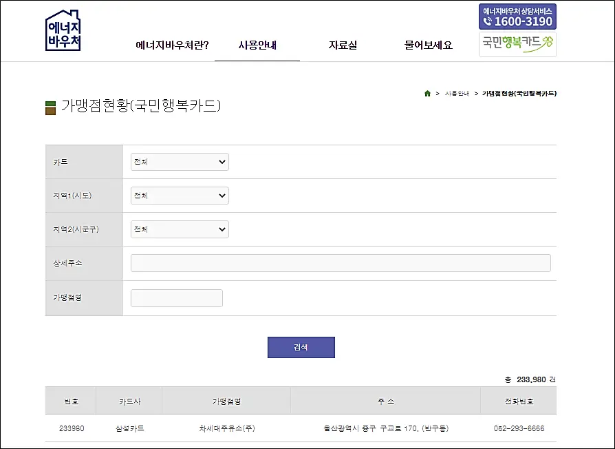 국민행복카드 가맹점은 하기 에너지바우처 홈페이지에서 검색 가능합니다.