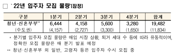 청년, 신혼부부 2022년 입주자 모집 물량은 하기와 같습니다.