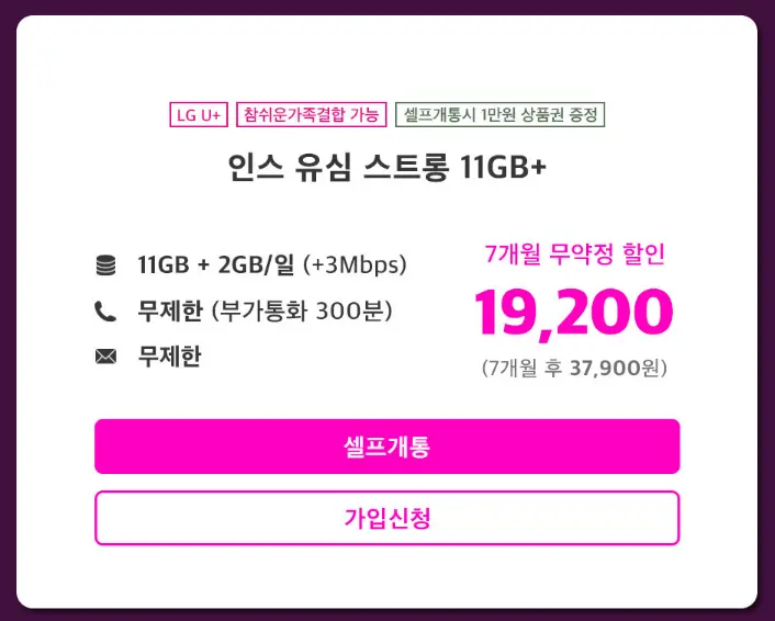 데이터 무제한 요금제 인스모바일 인스 유심 스트롱 15GB+
