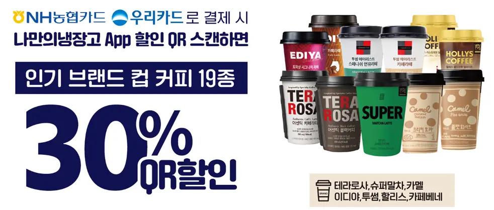 NH농협카드, 우리카드는 커피 30%할인, 삼성카드는 홈술용 술안주 할인입니다.