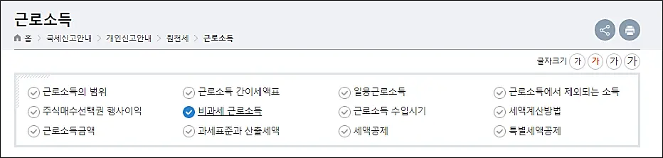 기타 근로소득의 비과세 포함하여 추가 비과세 항목에 대한 자세한 사항은 하기 국세청 홈페이지의 비과세 근로소득 항목을 참조하실 수 있습니다. 더 세부적인 정보들이 모두 나와있습니다. 정말 좋은 정보들이 많으므로 한번 방문해 보시는 것을 추천드립니다.