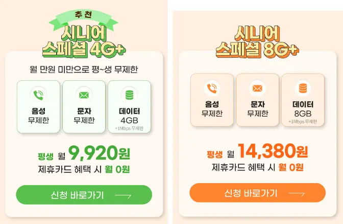 시니어 요금제는 티플러스에서 나온 4GB + 1Mbps 무제한 통화 문자 기본제공 9,920 원이 제격이라고 생각됩니다.
