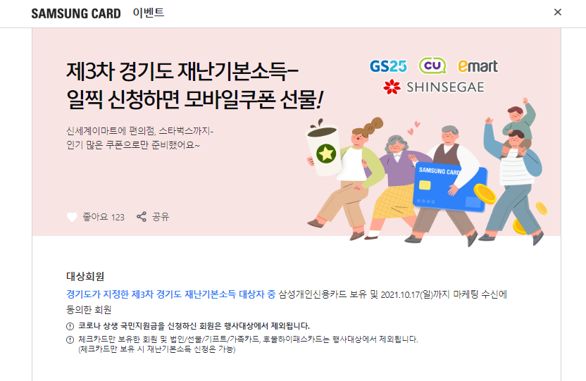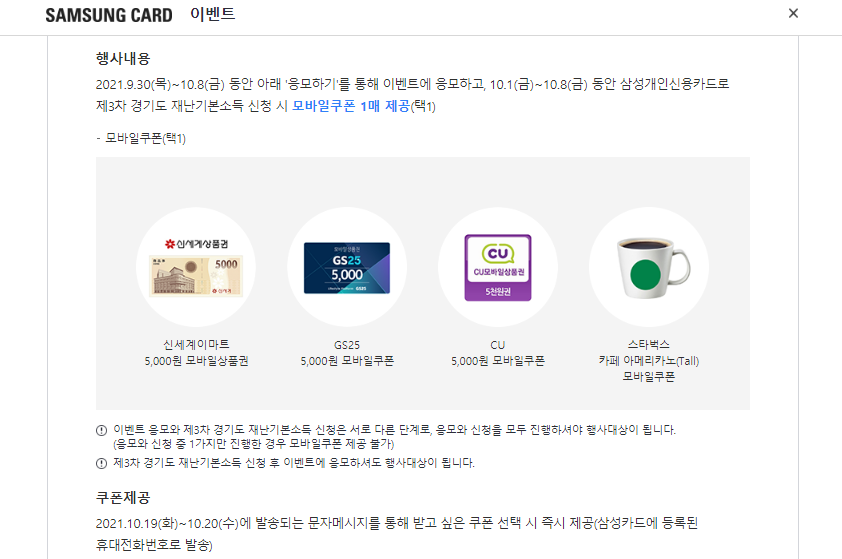 이번에는 국민지원금과는 달리 카드 혜택이 있는데요. 삼성카드의 경우 하기의 혜택을 제공하고 있으니 놓치지 마시기 바랍니다.