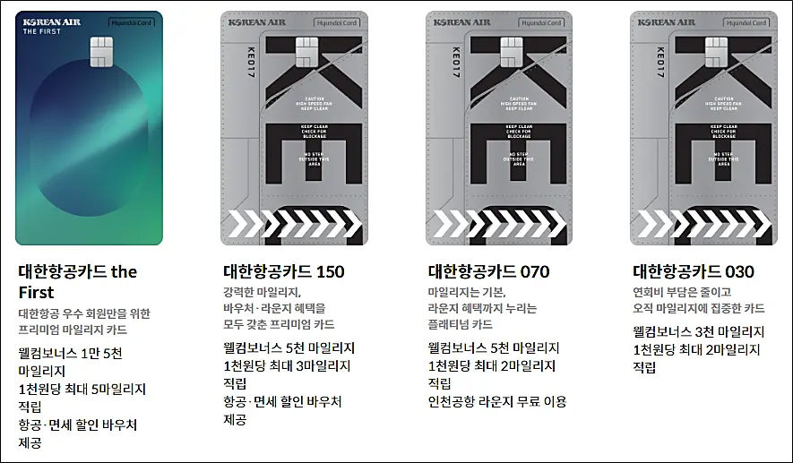 카드 뒤의 숫자는 연회비를 뜻하는 것으로 030 은 3만원 070 은 7만원 150은 15만원 인데 대신 마일리지 적립률이 다른 마일리지 카드들에 비해 엄청나게 높고 혜택이 많은 카드라 주력까지는 아니더라도 세컨 카드 정도만 되도 연회비 이상은 챙길수 있는 카드들입니다. the First 카드는 현대카드의 프리미엄 카드라 발급 조건이 따로 있지만 예전과 달리 많이 조건이 완화되었습니다.