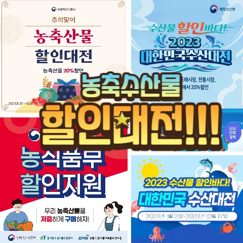 농축수산물 소비자 물가 안정 및 소비활성화를 위해 해양수산부와 농림축산식품부가 공동으로 개최하는 농축수산물 할인대전은 온라인 쇼핑몰 오프라인 대형마트에서 최대 60% 반값이 넘는 할인까지 가능할정도로 할인폭이 큰 정부지원 행사입니다. 뿐만 아니라 전통시장 당일구매금액 최대 30% 온누리상품권 환급 행사도 빠질수 없습니다. 수산대전의 경우는 추석 뿐만 아니라 매달 계속 진행됩니다.