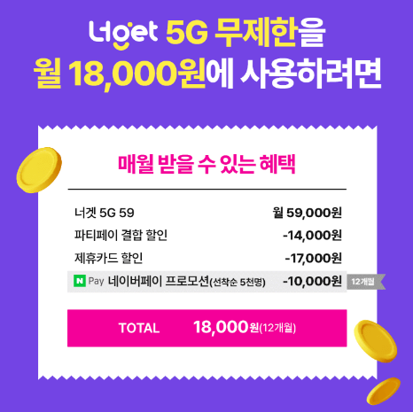 너겟 파티페이는 지인 결합 상품입니다. 5G 요금제의 경우 5만 9천원이지만 파티페이와 제휴카드 결합시 2만원대로 5G 무제한 요금제를 사용하실수 있습니다. 알뜰폰도 5G 무제한 요금제를 이 가격대로 제공하지 못합니다.