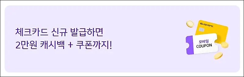 특히 KB 국민은행 체크카드는 거의 매달 신규발급 이벤트가 있습니다. 이번달에도 체크카드 신규발급시 2만원 캐시백에 5천원 CU 쿠폰이 증정됩니다.