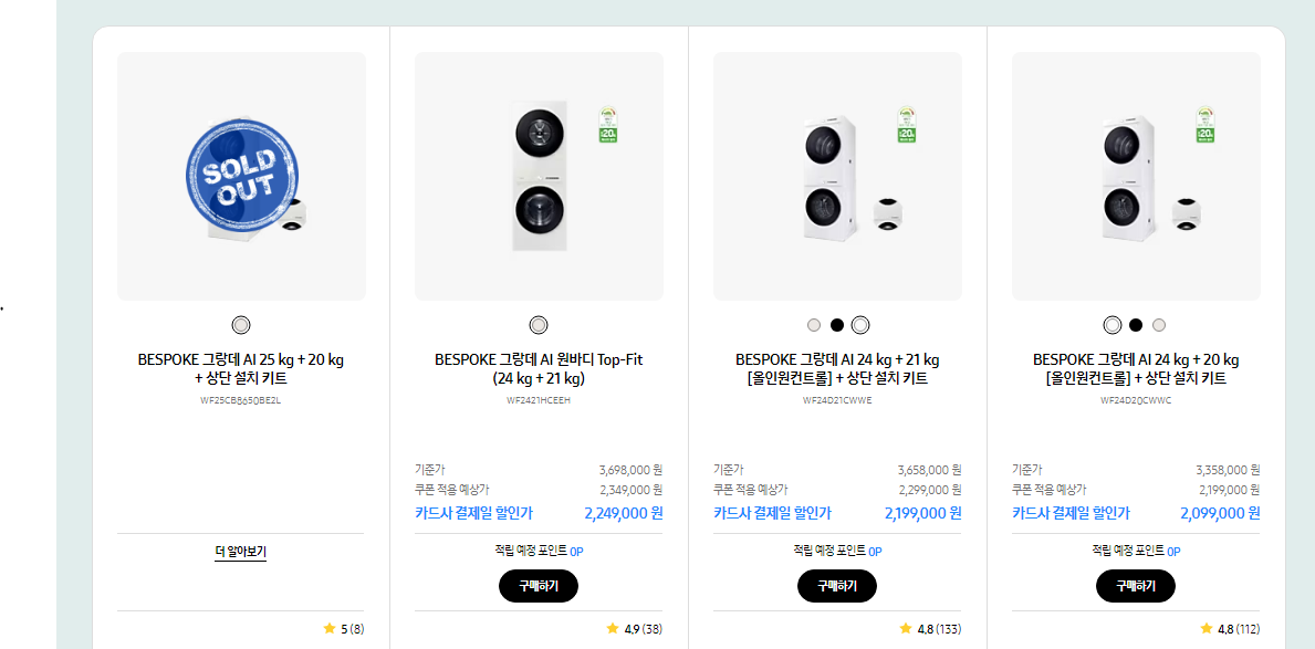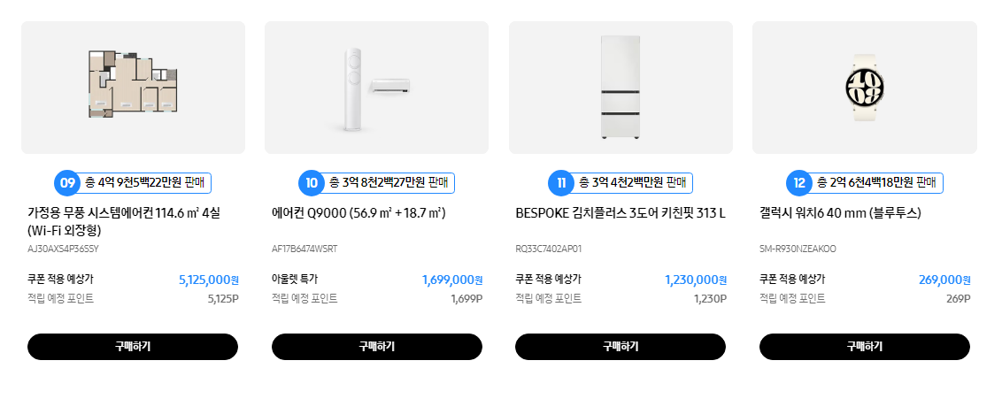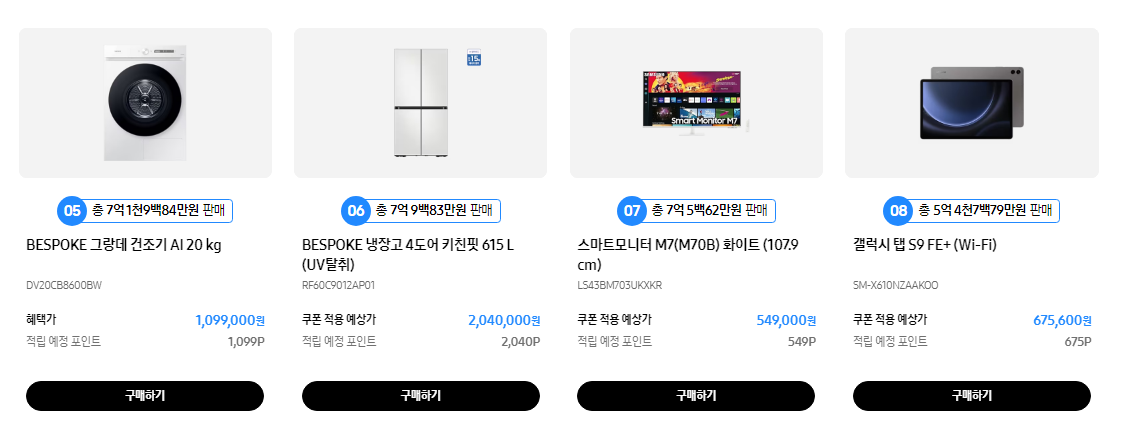 이후로는 BESPOKE 그랑데 건조기 BESPOKE 냉장고 4도어 그리고 갤럭시탭S9FE 가 인기입니다.