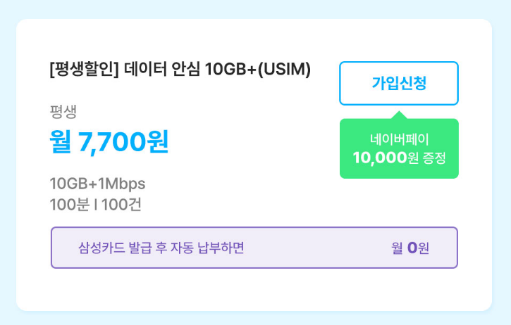 삼성카드 발급하여 자동납부 선택시 월 0원이 되는 요금제이기도 합니다.