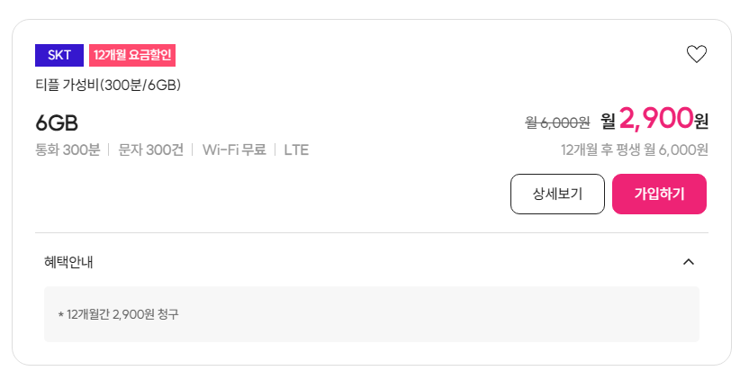6GB 12개월 2,900원 요금제인데 12개월 이후 평생 6,000원 입니다.
