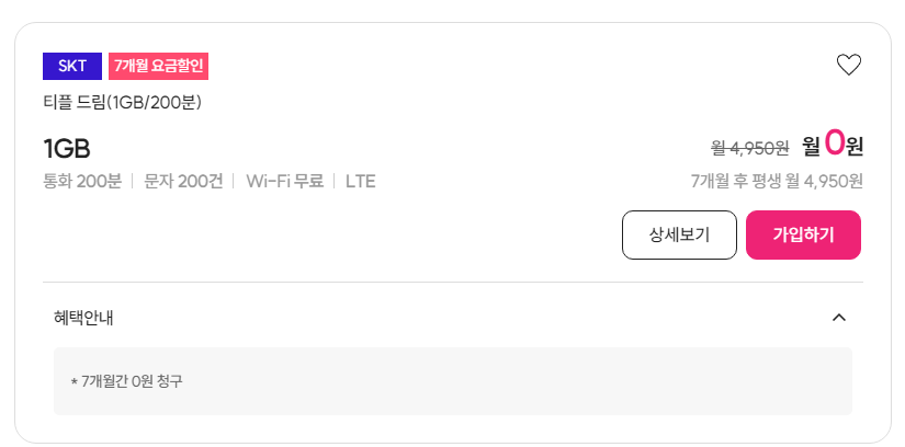 티플드림 1GB 200분 200건 7개월 0원 또는 110원을 선택하실수 있습니다. 7개월 후 0원 요금제는 평생 4,950원 110원 요금제는 3,850원입니다. 오래쓰실거라면 110원 요금제를 추천드립니다.