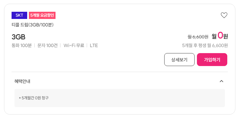 티플드림 3GB 100분 5개월 0원 요금제입니다.