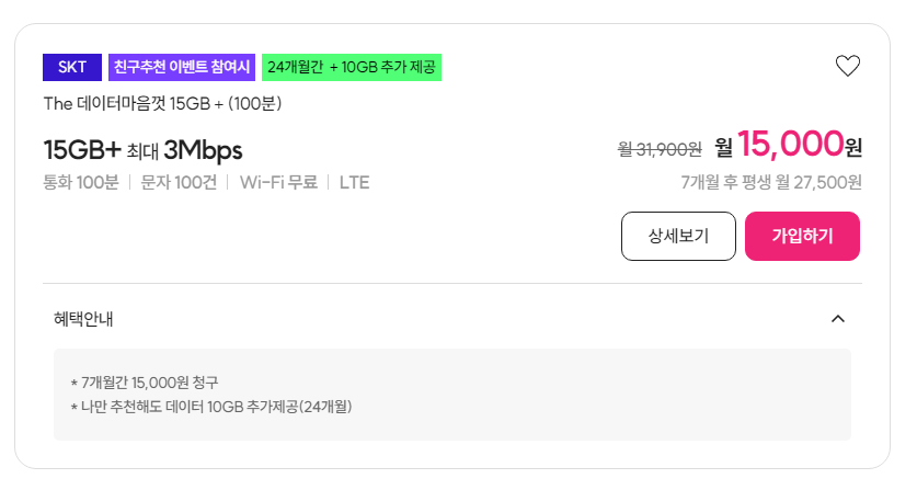 티플러스 15GB+3Mbps 상품으로 친구추천 이벤트 참여시 10G 를 추가로 더줍니다. 본인이 본인을 추천해도 되기 때문에 사실상 25GB 요금제나 마찬가지라고 할수 있습니다.
