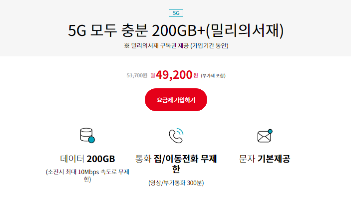 스카이라이프 요금제 추천입니다. 5G 200GB + 10Mbps 로 평생요금제 49,200원이면 대단한 메리트라고 생각됩니다.