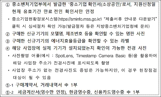 | 제출서류 | 중소기업 확인서 기기명판 구매증빙서류 등 |