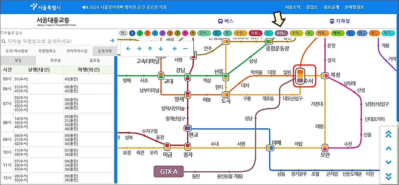상기화면에서 상단 화살표 GTX 를 클릭하면 하단에 노선이 나타나고 해당 노선 중 GTX 를 선택하면 좌측 운행정보가 나타납니다.